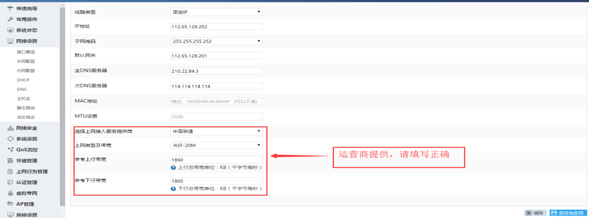 答:进入【网络设置】——》【外网配置】选择好运营商带宽,路由器会给出配置的参考值。
