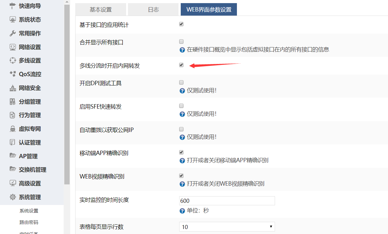 由于内网使用了多个网段的ip,需要在路由器的系统设置里面的WEB页面参数设置把“多线分流时开启内网转发”勾上,再点一下“保存&应用”。