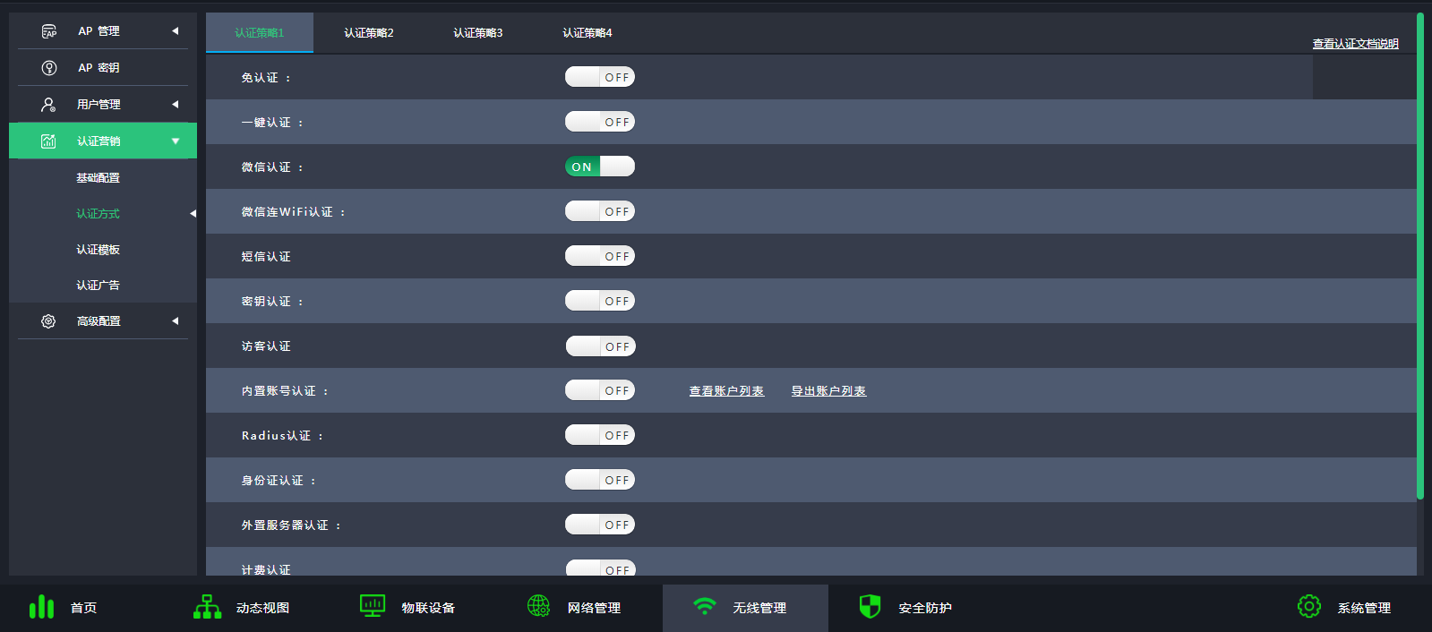 2、进入认证方式 页面,在认证策略中打开微信认证开关。