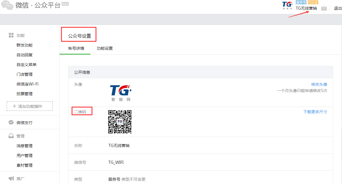 要实现微信认证,前提是商家需要有已认证的微信公众平台的账号,商家可以在微信公众平台配置好推送的自动回复消息,下载好二维码(如下图所示)。