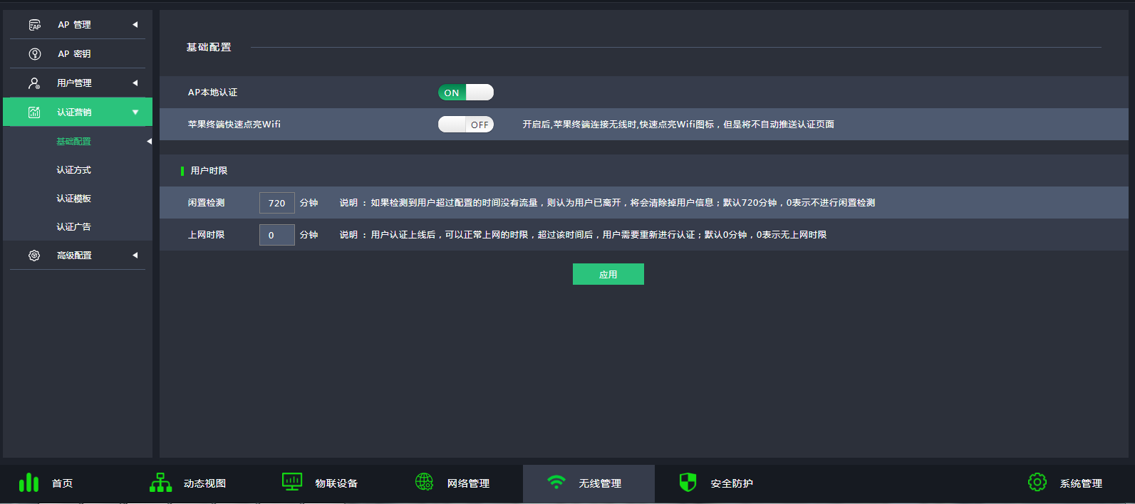 1、web登录AC,进入无线管理>认证营销>基础配置页面,打开本地认证开关。